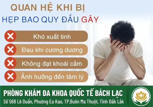 Khó xuất tinh: Hẹp bao quy đầu nặng, da bao quy đầu ôm chặt, cản trở kích thích tình dục và hạn chế chuyển động của quy đầu khi đạt cực khoái, khiến nam giới bị đau hoặc khó xuất tinh.
