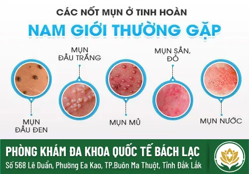 ● Mụn nước: Mụn nước là loại mụn có chứa dịch trong, đường kính vào khoảng 1mm đến 3mm. Loại mụn này xuất hiện ở tinh hoàn trong những bệnh lý như: thủy đậu, Herpes sinh dục, nhiễm HPV,...