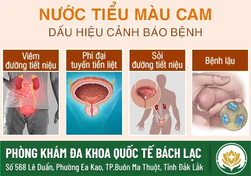 Sỏi đường tiết niệu: Khi người bệnh bị sỏi bàng quang, sỏi niệu quản hay sỏi thận cũng thường có biểu hiệu đi tiểu ra nước có màu cam, kèm theo tiểu rắt, tiểu đau, bí tiểu, đau buốt rát khi đi tiểu,…